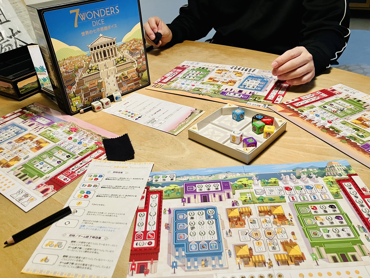 今日ご紹介するボードゲームは、世界的な名作「世界の七不思議」のダイス版です。