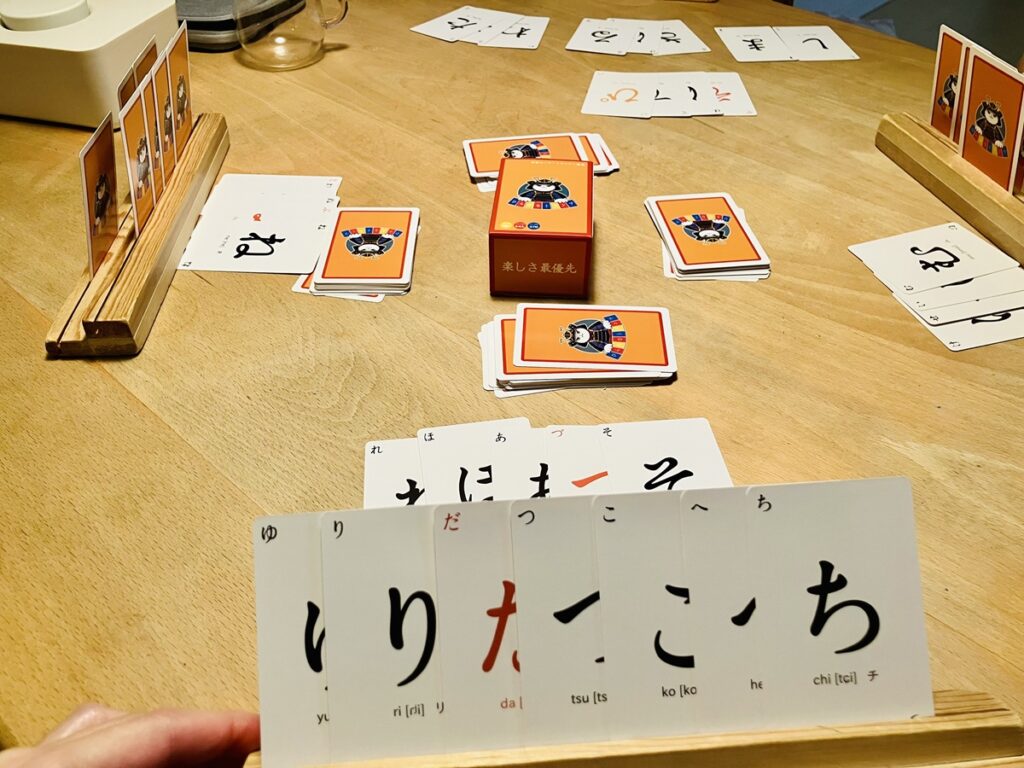 - じゃんけんで買った人から順番に山札からカードを1枚引き、合計8枚のひらがなカードを自由に組み合わせる。