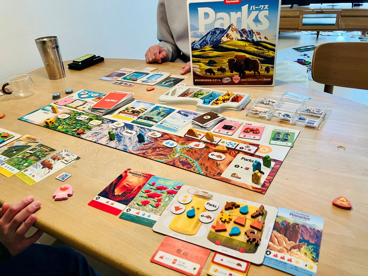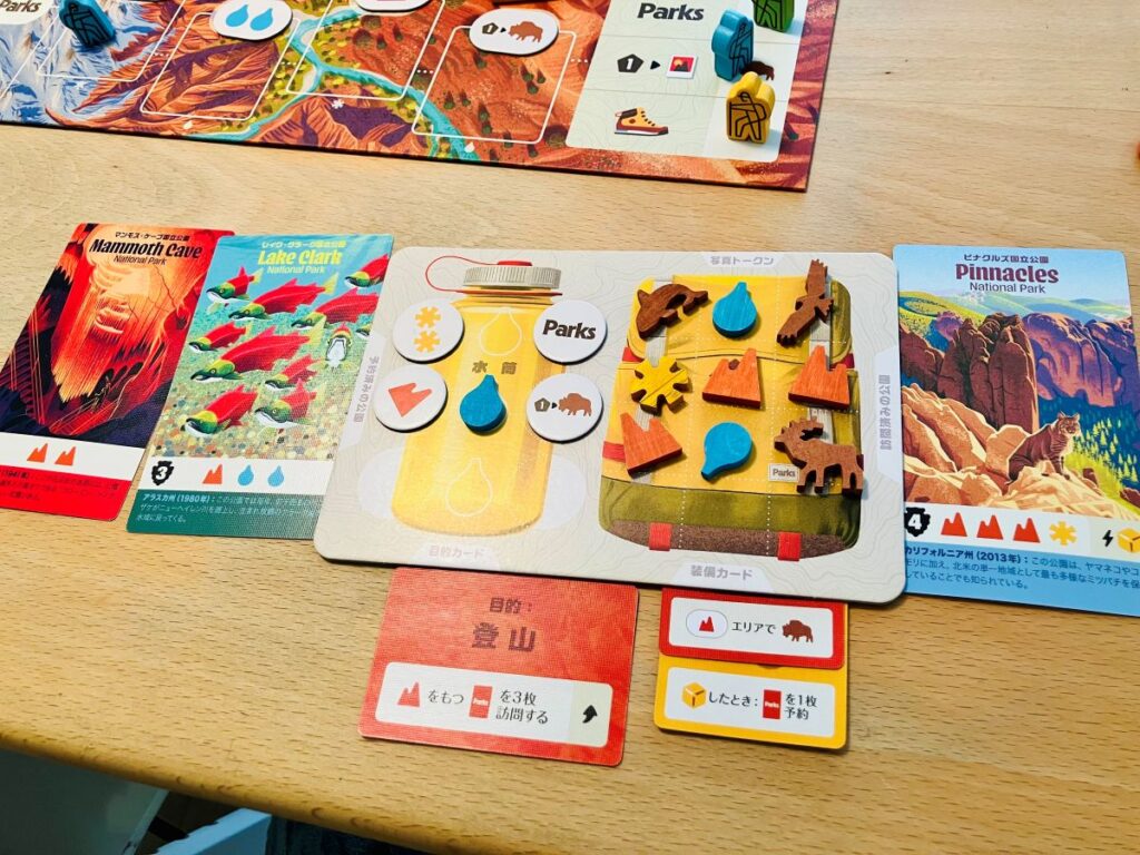 アメリカの国立公園がテーマで、カード絵やコンポーネントが何とも素敵なこのゲーム。